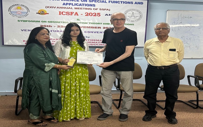 Dr. Adiba Naz received the A. K. Agarwal Prize for Best Publication of the Year 2025, awarded by the Society for Special Functions and their Applications (SSFA), during the International Conference on "Special Functions and Applications (ICSFA 2025)" held at Pondicherry University, Puducherry (November 20–22, 2025)